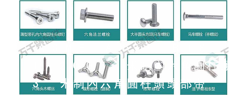 常用規格(公制螺絲、美規螺絲、英制螺絲):公制機械螺絲: Metric Ex:M3 x 6 – P P B : M3機械螺絲,6mm 長,十字,圓扁頭,鍍黑。Finish Code:外觀處理規格 Head Code:頭部外型。螺絲頭部外形。圓柱頭。半沉頭 1.2.6 緊固件用六角花形1.2.7 螺栓和螺釘通孔1.2.8 六角頭螺栓和六角螺母用沉孔1.2.9 螺釘用十字槽1.2.10 螺桿帶孔螺栓和螺柱的開口銷孔1.2.11 頭部帶孔螺栓的金屬絲孔1.2.12 鉚釘用通孔1.2.13 鉚釘用桿徑1.2.14 普通內、